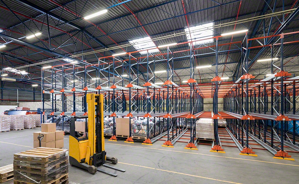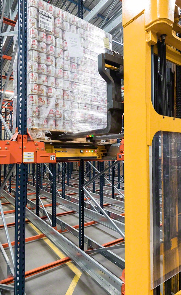Mecalux ha equipado el depósito con un bloque de racks penetrables atendidos por el sistema Pallet Shuttle semiautomático. Los racks miden 6,5 m de altura y 62 m de longitud. Cada canal puede albergar hasta un máximo de dieciocho pallets en profundidad. De este modo, puede alojar un gran número de pallets y de referencias.