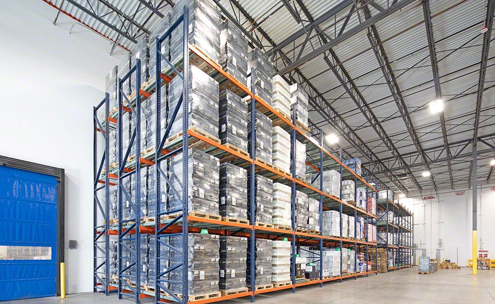 El depósito está formado por 31 pasillos con racks selectivos de simple profundidad a cada lado. Miden 9 m de altura (con cuatro a siete niveles) y dan cabida a 9.200 pallets GMA de 1.000 x 1.200 mm.