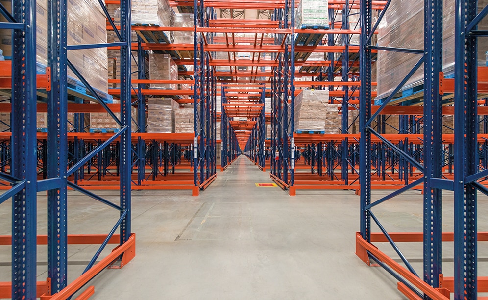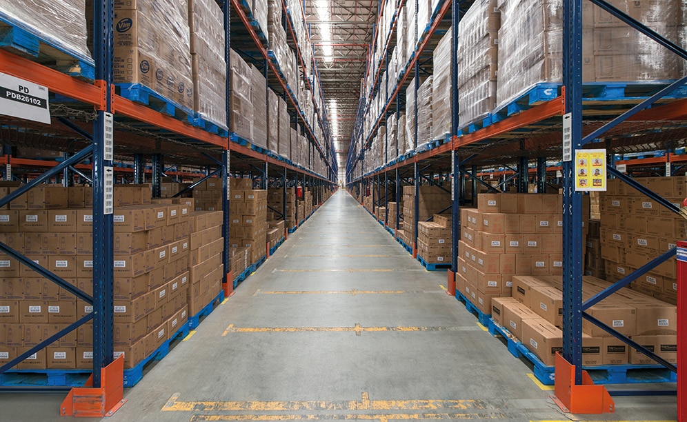 Mecalux ha suministrado racks selectivos de simple y doble profundidad de 11,4 m de altura, con cinco o seis niveles, y 152 m de longitud. En total, presentan una capacidad de almacenamiento para 83.569 pallets de 1.000 x 1.200 mm.