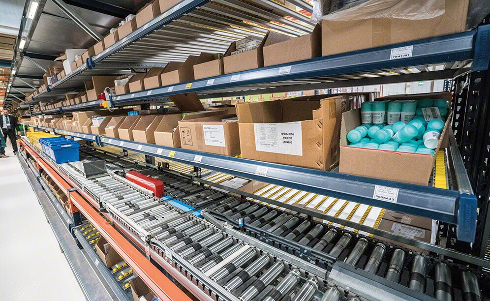 El depósito está sectorizado en cinco zonas distintas. En dos sectores, destinados a los productos de tipo A, Mecalux ha suministrado estanterías para cargas ligeras con estantes y estanterías de picking dinámico, en los que se alojan productos que abastecen el dispensador automático de cajas individuales.