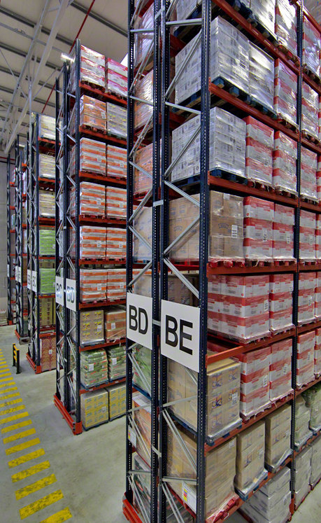 En total, se han instalado siete racks dobles y uno selectivo, y dos bloques de estanterías con el sistema Pallet Shuttle, con seis niveles de carga y capacidad para almacenar 15 pallets en fondo por nivel. El depósito dispone de ocho pasillos de almacenamiento, uno de ellos común a ambos sistemas, y dos pasillos transversales que a la vez sirven de pasillos de evacuación.
