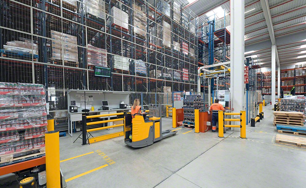El depósito automático se compone de dos bloques de estanterías de 12,6 m de altura, con cuatro niveles que admiten seis pallets en profundidad y una capacidad de almacenaje para 2.556 pallets de 1.200 kg.