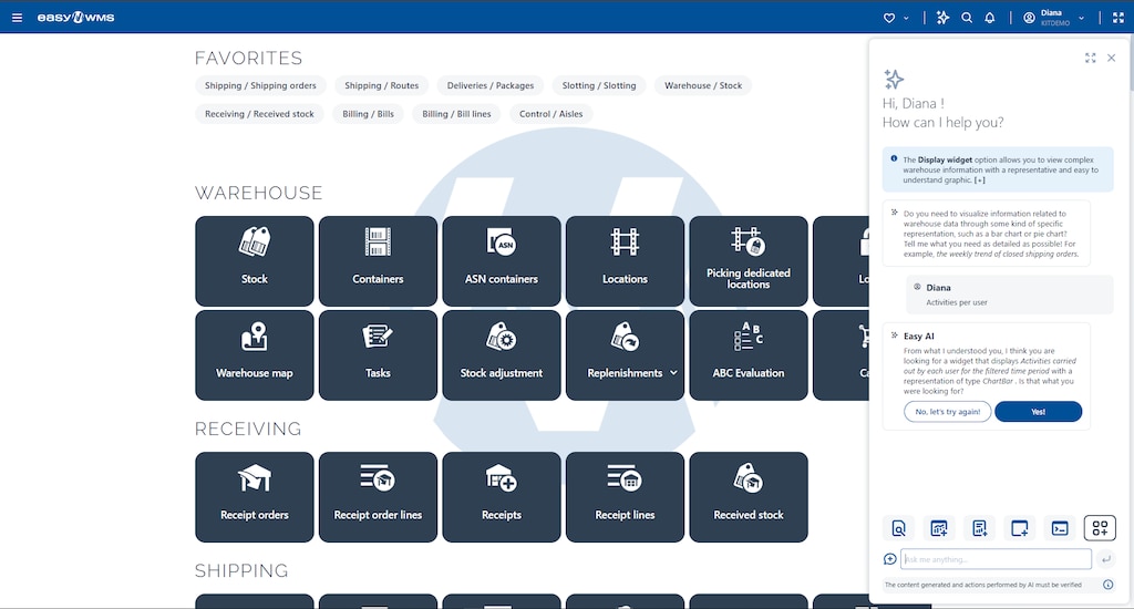 Desde la interfaz de usuario de Easy WMS ahora es posible acceder a un chatbot impulsado por Easy AI que permite al usuario agilizar las tareas diarias en sus instalaciones, mejorar los procesos, acceder a los datos de manera más eficiente y minimizar errores humanos.
