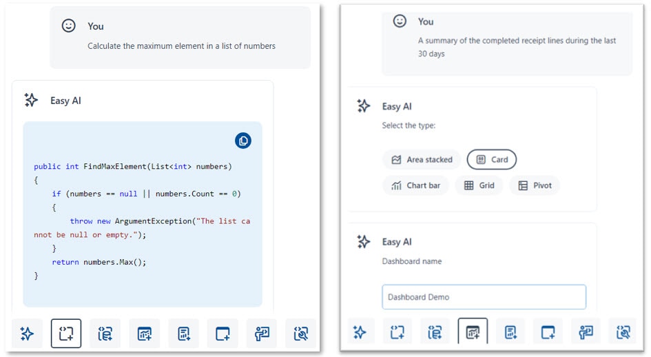 - Generación de dashboards. Easy AI guía al desarrollador preguntándole lo que necesita para generar un dashboard totalmente funcional en la aplicación seleccionada. Este usuario avanzado puede editar el dashboard y diseñarlo manualmente utilizando el diseñador de dashboards integrado.